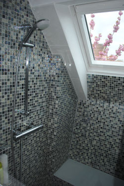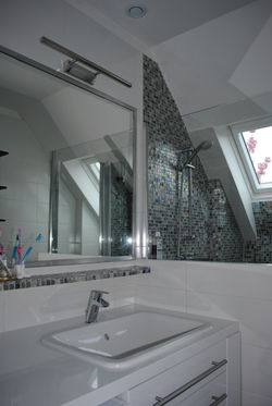 L'existant comptant une baignoire, un lavabo et un lave-linge, le propriétaire voulait ajouter un WC et remplaer la baignoire par une douche, tout en profitant de l'occasion, pour agrandir la salle de bains sous combles. Le style est contemporain en couleurs neutres. Le choix de finitions est de la faïence blanche en 60x20 cm., de la mosaïque en verre et du mobilier blanc et bois couleur wenge. Les fonctions assises dont WC et banc de douche intergé sont coté sous-combles avec les hauteurs les plus restrictives. Ils sont alignés, l'un sous le velux existant et l'autre sous un deuxième velux qui agrandit l'espace par une gain d'hauteur utile tout en ajoutant de la lumière naturelle. Les nouvelles évacuations, restent accessibles par le garage. L'isolant thermique à été renforcé.
